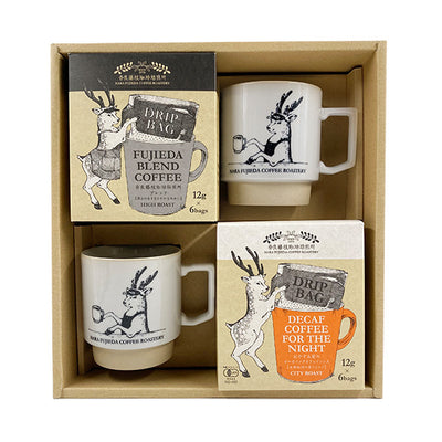 ドリップバッグコーヒーと奈良藤枝珈琲焙煎所オリジナルマグカップのギフトセットです。本格的な味や香りを楽しめる自家焙煎珈琲を専用のギフトBOXでお届けします。